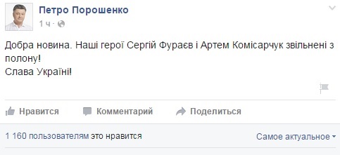 “Хороша новина. Наші герої Сергій Фураєва і Артем Комісарчук звільнені з полону! Слава Україні!” – Написав Порошенко на своїй сторінці в Facebook.
