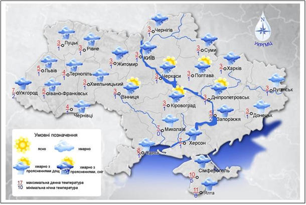 У деяких областях, крім південних, очікується налипання мокрого снігу, на дорогах ожеледиця. Температура вночі буде -2…+3 °С, вдень повітря прогріється до 0…+5 °С.