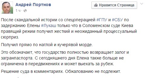 “Це означає, що держава повністю повертає заставу і закордонний паспорт. З сьогоднішнього дня Олена також більше не обмежена в пересуваннях і може виїхати за кордон. Рішення суду в коментарях. Оскарженню не підлягає”, – написав Портнов.