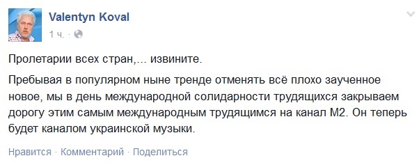Генеральний директор українських музично–розважальних каналів М1 та М2 повідомив на своїй сторінці в Facebook про те, що з 1 травня в ефірі каналу М2 буде звучати тільки музика українських виконавців.