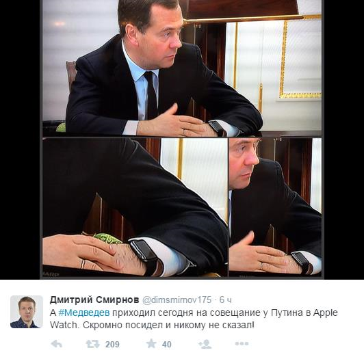 Прем’єр-міністр Росії Дмитро Медведєв прийшов в середу, 20 травня, на нараду до президента Володимира Путіна в годиннику Apple Watch. Про це у своєму Twitter повідомив журналіст Комсомольської правди Дмитро Смирнов.